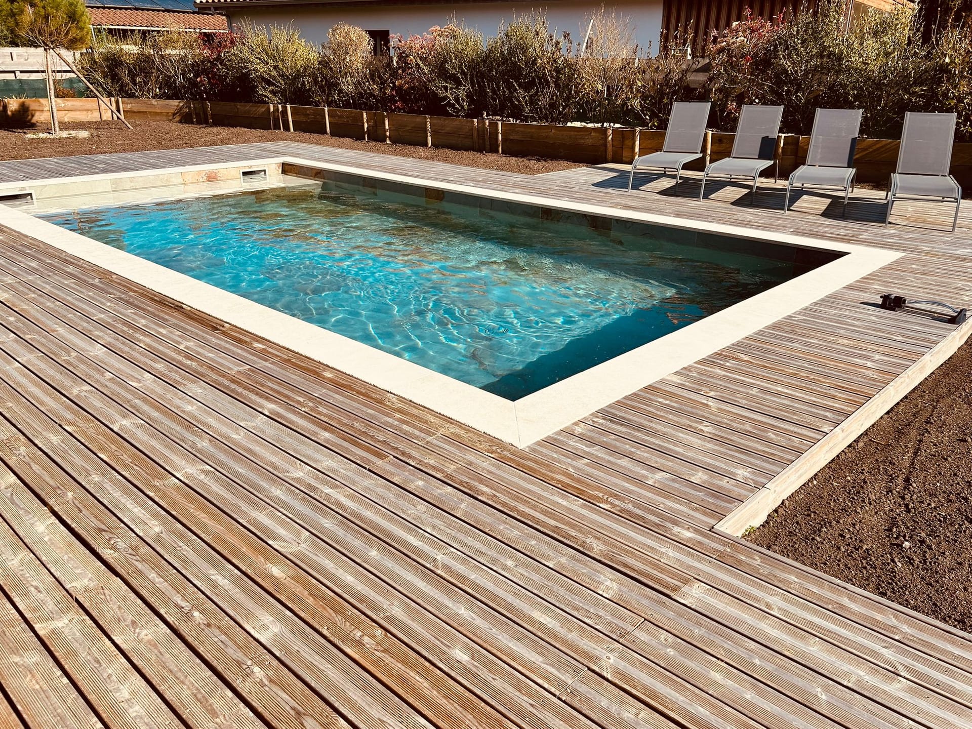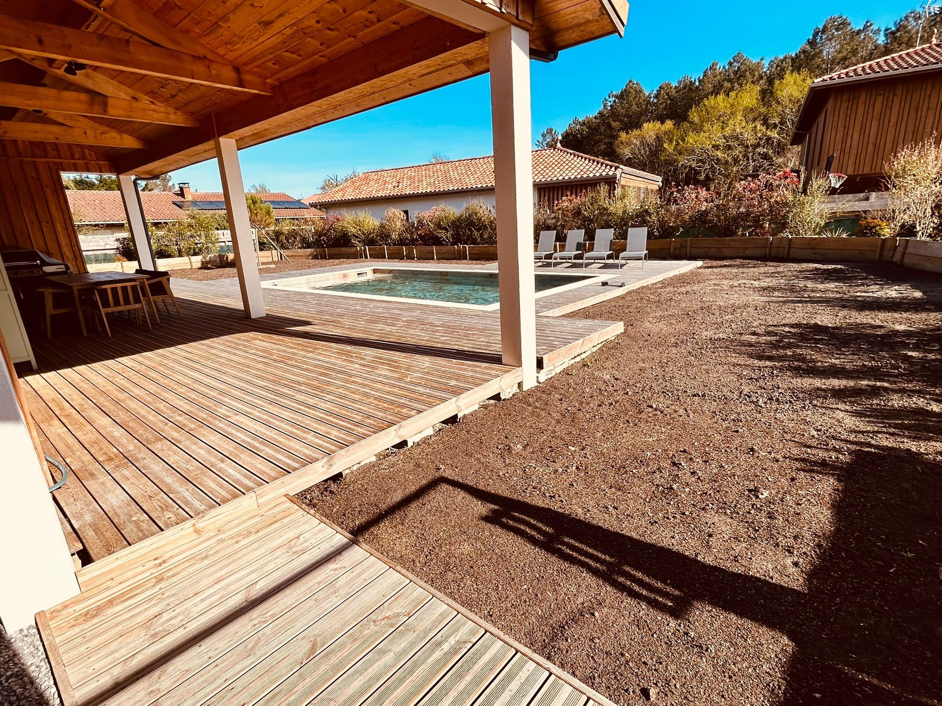 Grande piscine sur terrasse en bois avec transats, douche extérieure et mobilier de jardin.
