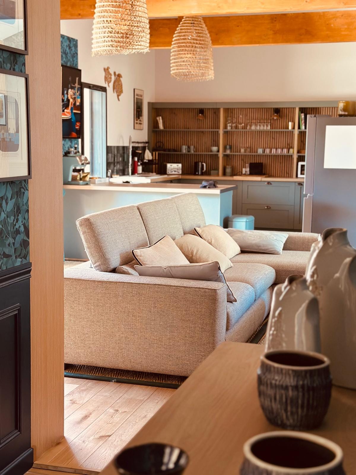 Cuisine ouverte entièrement équipée : machine à café, îlot de bar, frigo américain et tout le nécessaire.